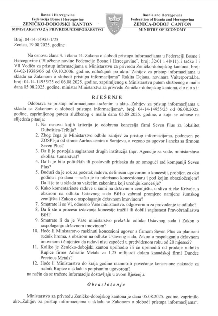 Pitanja u vezi sa početkom istraživanja na lokalitetu Duboštica-Tribija, radom postojećeg rudnika Rupice, uticajem rudnika i istraživanja na životnu sredinu u regiji Vareša, ali i dozvolama i prihodimakoje opština Vareš ima i može imati od novih rudnika, na adresu načelnika ove opštine poslali smo početkom avgusta ove godine. Odgovori su, nakon više poziva, insistiranja ali i odlaska na lice mjesta pred zgradu opštinske uprave u Varešu, stigli nakon četrdesetak dana. Inače, zakonski rok prema Zakonu o slobodi pristupa informacijama u Federaciji BiH je 15 dana.