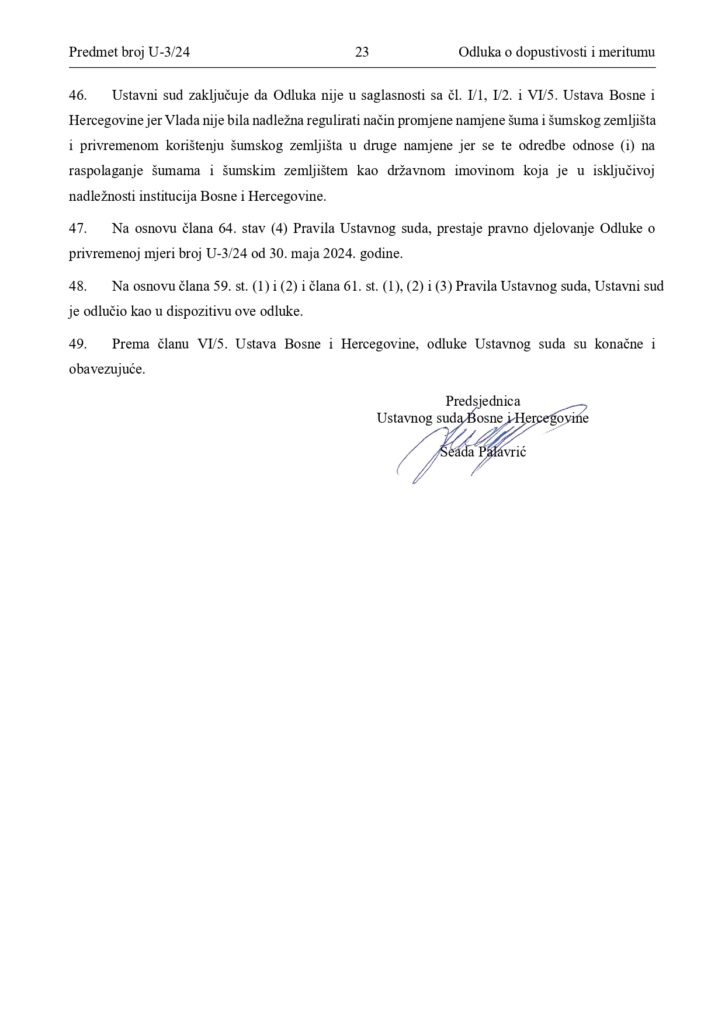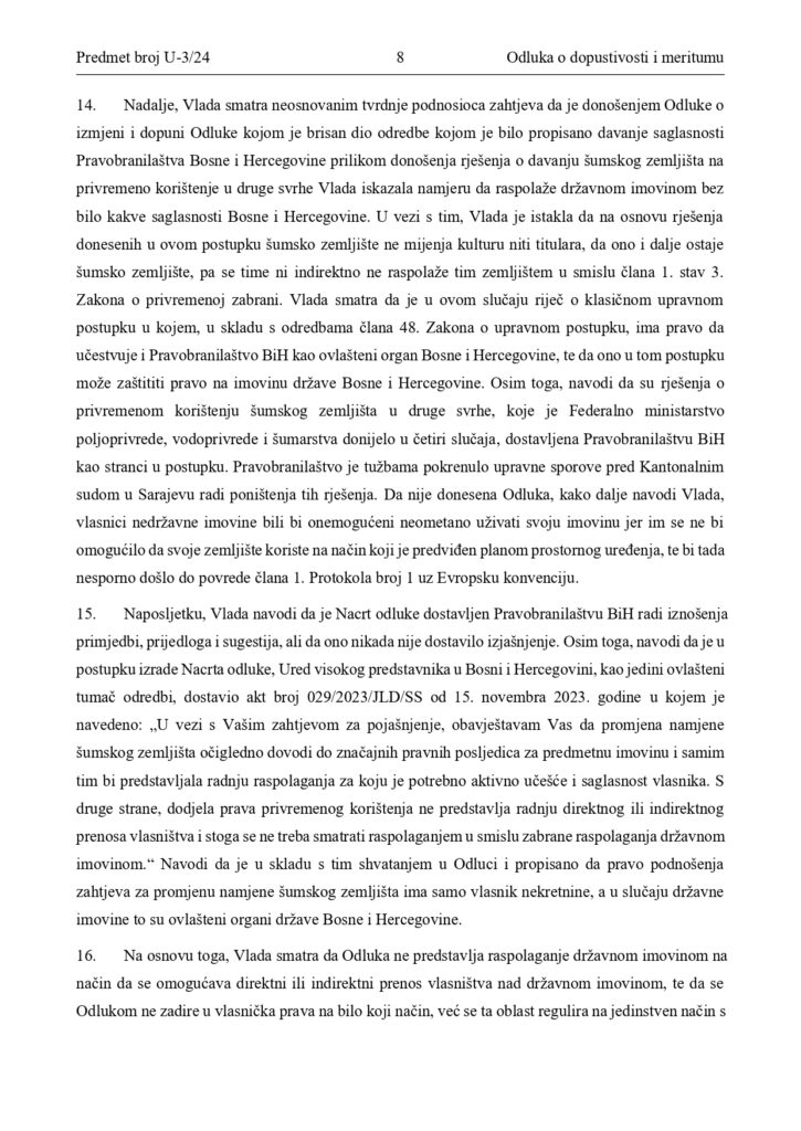 Ustavni sud BiH je u aprilu 2024. donio odluku u predmetu U-3/24, kojom je jasno utvrđeno da se državna imovina ne može koristiti, prenamjenjivati niti dodjeljivati bez saglasnosti nadležnih državnih organa. Ovom presudom dodatno je potvrđeno da entiteti, kantoni i opštine ne mogu samoinicijativno raspolagati državnim zemljištem, uključujući i šumsko-poljoprivredne površine, bez odluke institucija BiH.